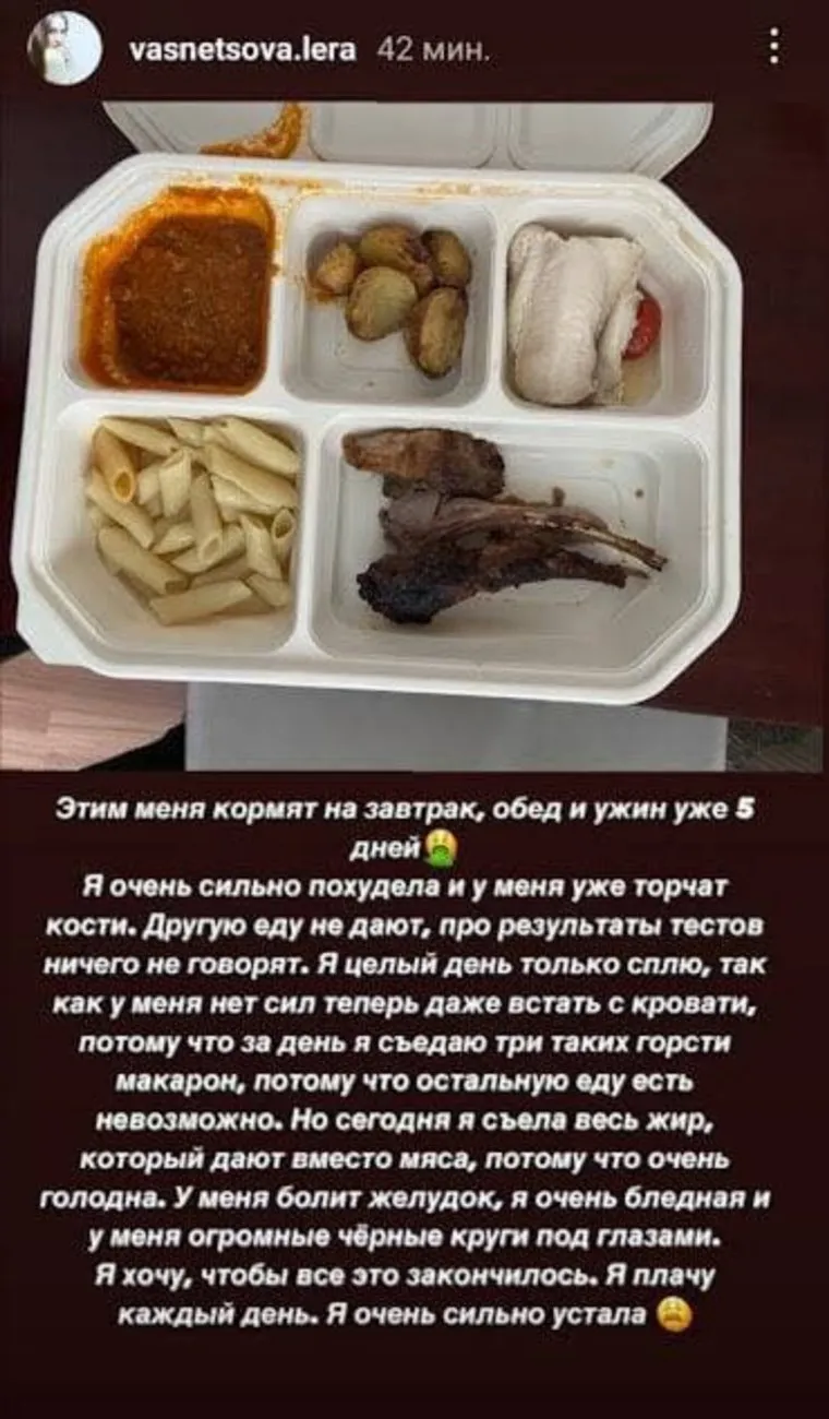На фотографии — горсть макарон, картофеля, порция мяса и соус. По словам биатлонистки, от рациона в ковид-отеле у нее «болит желудок» и образовались «черные круги под глазами». «Я хочу, чтобы это все закончилось. Я плачу каждый день. Я очень сильно устала», — пишет она.