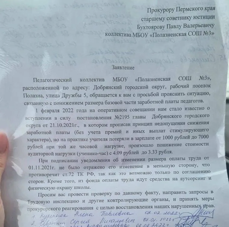 В telegram-канале «Слуховой анализатор» опубликовано заявление педагогов, адресованное прокурору Пермского края Павлу Бухтоярову. Однако заявление подписано учителями школы №3, расположенной в поселке Полазна, что находится недалеко от Добрянки. «Педагогический коллектив МБОУ „Полазненская СОШ №3“ […] обращается к вам с просьбой прояснить ситуацию, связанную с понижением базовой части зарплаты педагогов», — говорится в заявлении.