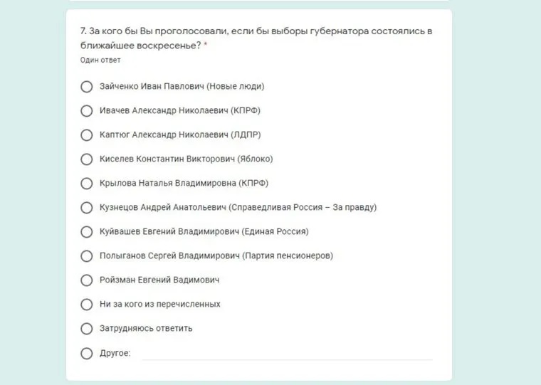 Помимо данных о самом респонденте (пол, возраст, место проживания), составители теста спрашивают, пойдет ли участник на сентябрьские выборы и за кого отдаст свой голос. Всего предложены девять гипотетических кандидатов: действующий губернатор Евгений Куйвашев от «Единой России», Иван Зайченко из «Новых людей», коммунисты Александр Ивачев и Наталья Крылова, Александр Каптюг из ЛДПР, Константин Киселев от «Яблока», Сергей Полыганов от «Партии пенсионеров», справоросс Андрей Кузнецов и самовыдвиженец Евгений Ройзман. На данный момент ни один из них не объявлял об участии в выборах.