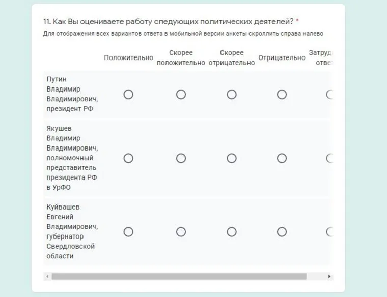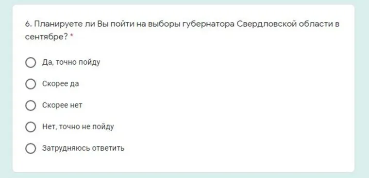 «Приглашаем принять участие в опросе неравнодушных жителей Свердловской области. Нам интересно ваше мнение о текущем положении дел в регионе. Просим вас ответить на несколько вопросов», — говорится в аннотации к опросу. Всего в анкете 17 вопросов с обязательным выбором одного ответа из предложенных.