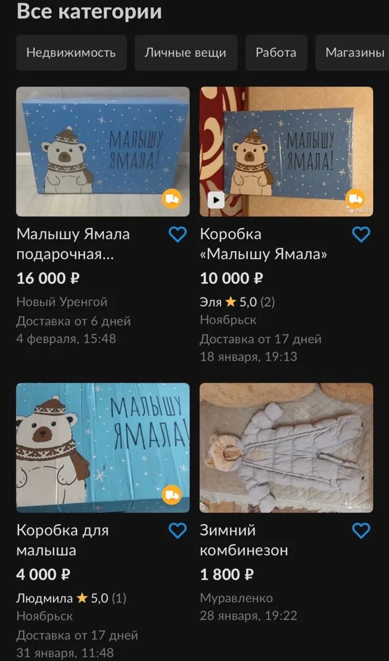 «Новая не вскрытая коробка „Малышу Ямала“. Отличный подарочный набор для новорожденного малыша! Можно привезти в подарок родственникам на (большую) землю», — говорится в описании к одному из объявлений. Стоимость набора варьируется от 10 до 16 тысяч рублей. Использованный набор продают за четыре тысячи рублей.