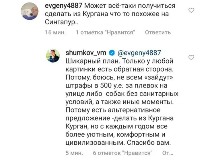 «У любой картинки есть обратная сторона. Потому, боюсь, не всем „зайдут“ штрафы в 500 у. е. за плевок на улице либо собак без санитарных условий, а также иные моменты», — ответил губернатор пользователю evegeny4887, который спросил, получится ли из Кургана сделать что-то похожее на Сингапур.