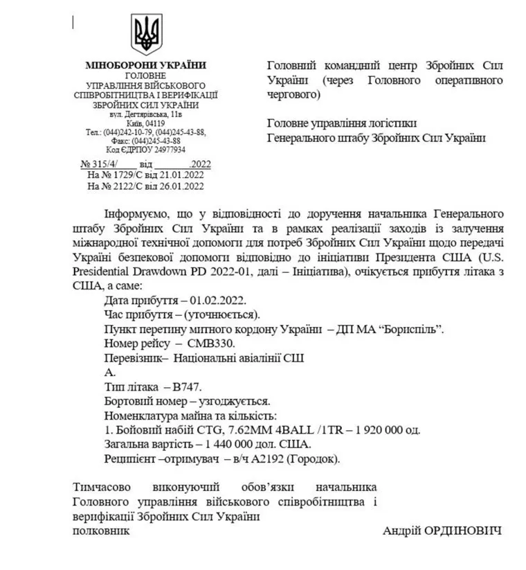 «Поставки идут с 2014 года, и сейчас объемы ввозимого „оборонительного“ оружия наращиваются. Вооружение и военное имущество уже поставлено на сумму более 700 миллионов долларов!» — сообщается в telegram-канале Beregini.