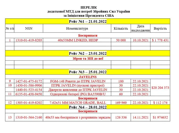Согласно документам, опубликованным хакерской группой, в конце января 2022 года Украина получила 30 противотанковых комплексов Javelin. К ним прилагалось 180 ракет, а также боеприпасы и комплектующие. Общая сумма поставок составила более 24 миллионов долларов США.