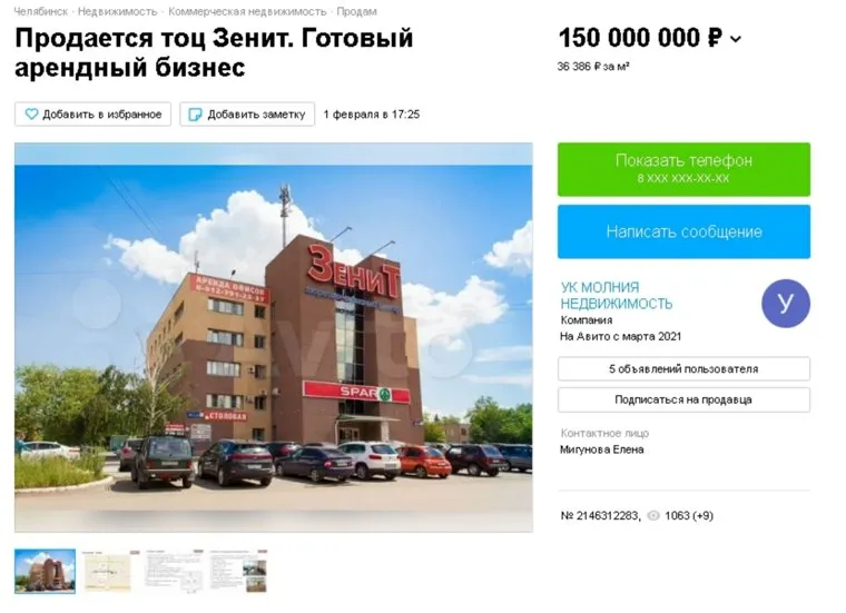 «Торгово-офисный центр „Зенит“ представляет собой пятиэтажное здание с цокольным этажом. Расположен в Курчатовском районе Челябинска с высокой плотностью застройки. Находится на пересечении транспортных магистралей в шаговой доступности от остановочных комплексов», — говорится в тексте объявления.