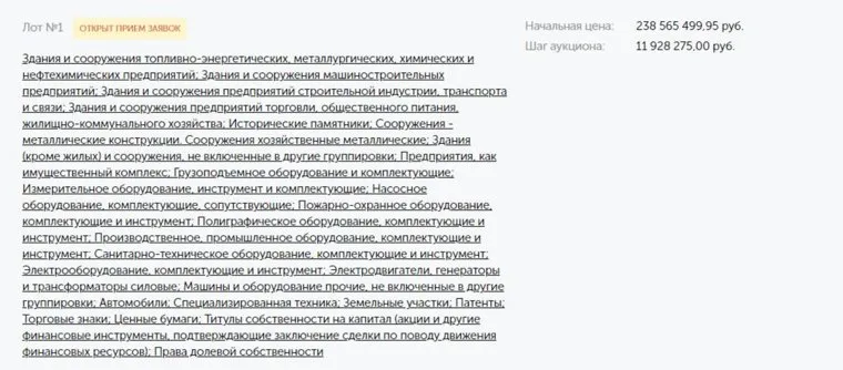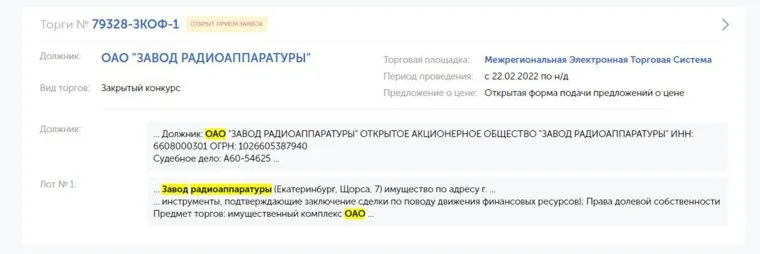 «Лот № 1. Имущественный комплекс ОАО Завод радиоаппаратуры (Екатеринбург, Щорса, 7) имущество по адресу город Екатеринбург, улица Щорса, 7. Начальная цена: 238 565 499,95 рубля. Шаг аукциона: 11 928 275 рублей», — сообщается на портале «Федресурс» Единого Федерального реестра сведений юридических лиц.