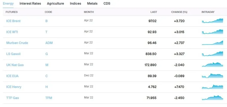 Апрельские фьючерсы на нефть, по данным на 22 февраля, резко взлетели в цене. Баррель марки Brent теперь реализуется за более чем 97 долларов США. Такие данные содержатся на бирже ICE.