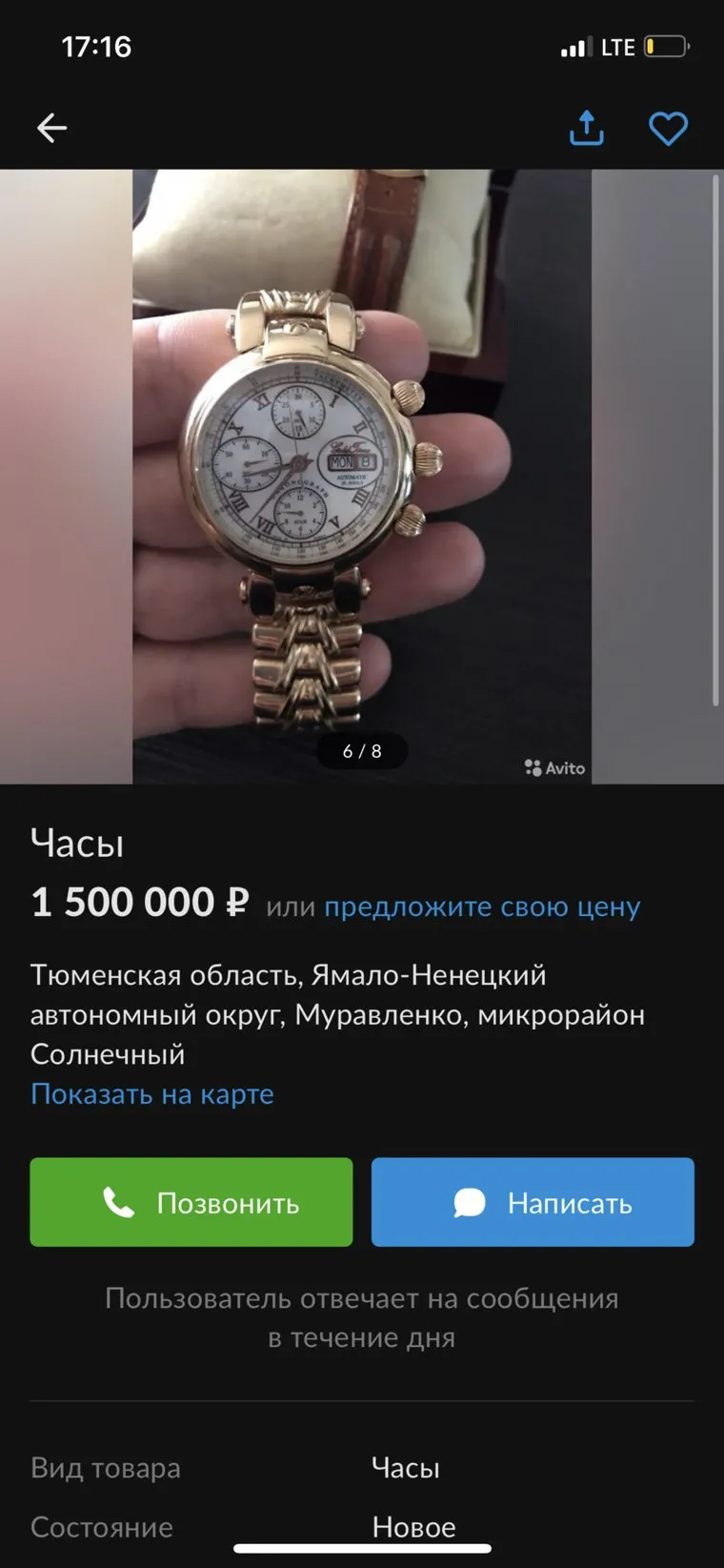 Золотые часы стоимостью в полтора миллиона рублей выставили на продажу в Муравленко. Объявление разместили на сайте Avito.
