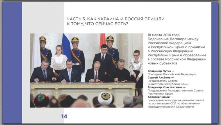 На слайдах, которые планируют показать ученикам, рассказывается об истории отношений России и Украины, попытках «переписать историю» в государствах Европы, событиях на Майдане и западных санкциях. По данным URA.RU, презентации были разосланы в школы из профильных ведомств, а классные часы требуется провести в самое ближайшее время.
