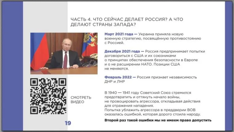 «В 1940—1941 году Советский Союз стремился предотвратить и оттянуть начало войны, не провоцировать агрессора, откладывая действия для отражения нападения. Попытка ублажить агрессора в преддверии Великой Отечественной войны оказалась ошибкой, которая дорого стоила народу. Второй раз такой ошибки мы не имеем право допустить», — говорится в презентации для классного часа.