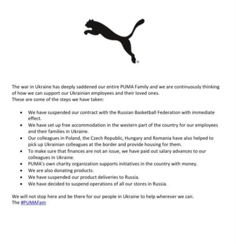 «Германская компания Puma объявила о прекращении поставок продукции в Россию и приостановке работы своих магазинов на территории РФ», — прокомментировали представители компании в Twitter.