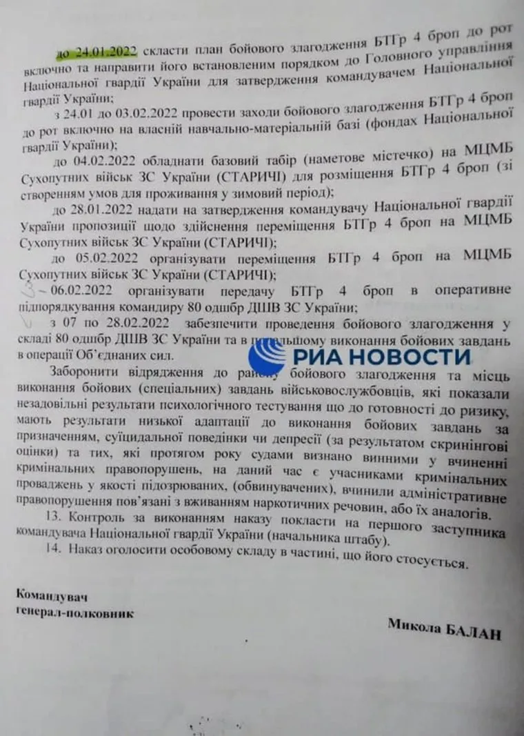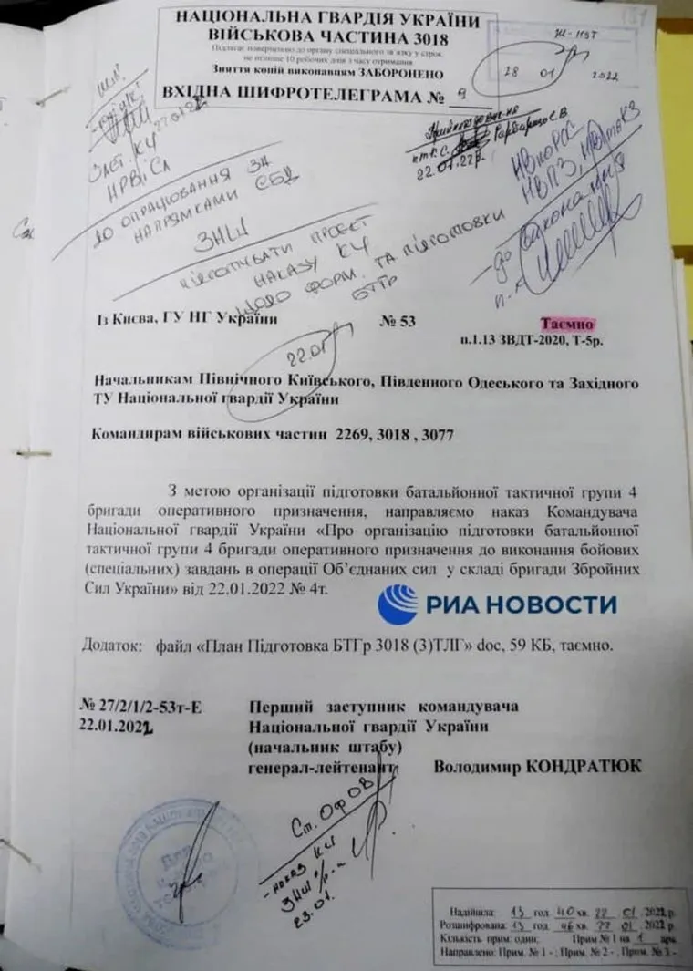«В руки российских военнослужащих попали секретные документы командования Нацгвардии Украины. Они подтверждают скрытую подготовку киевского режима к наступательной операции в Донбассе в марте 2022 года. Это секретный приказ командования Нацгвардии Украины», — сообщил официальный представитель Минобороны России Игорь Конашенков в ходе брифинга. Трансляция доступна на YouTube.
