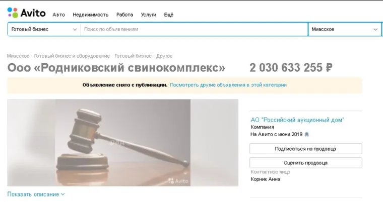 Свинокомплекс «Родниковский» в Челябинской области, входящий в группу компаний «Здоровая ферма», ранее принадлежавшей депутату Госдумы Олегу Колесникову, снят с продажи. За актив рассчитывали выручить более 2 млрд рублей, но теперь соответствующие объявления сняты с сайтов Avito и Российского аукционного дома.
