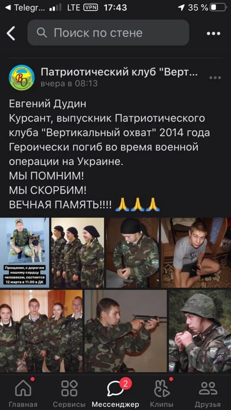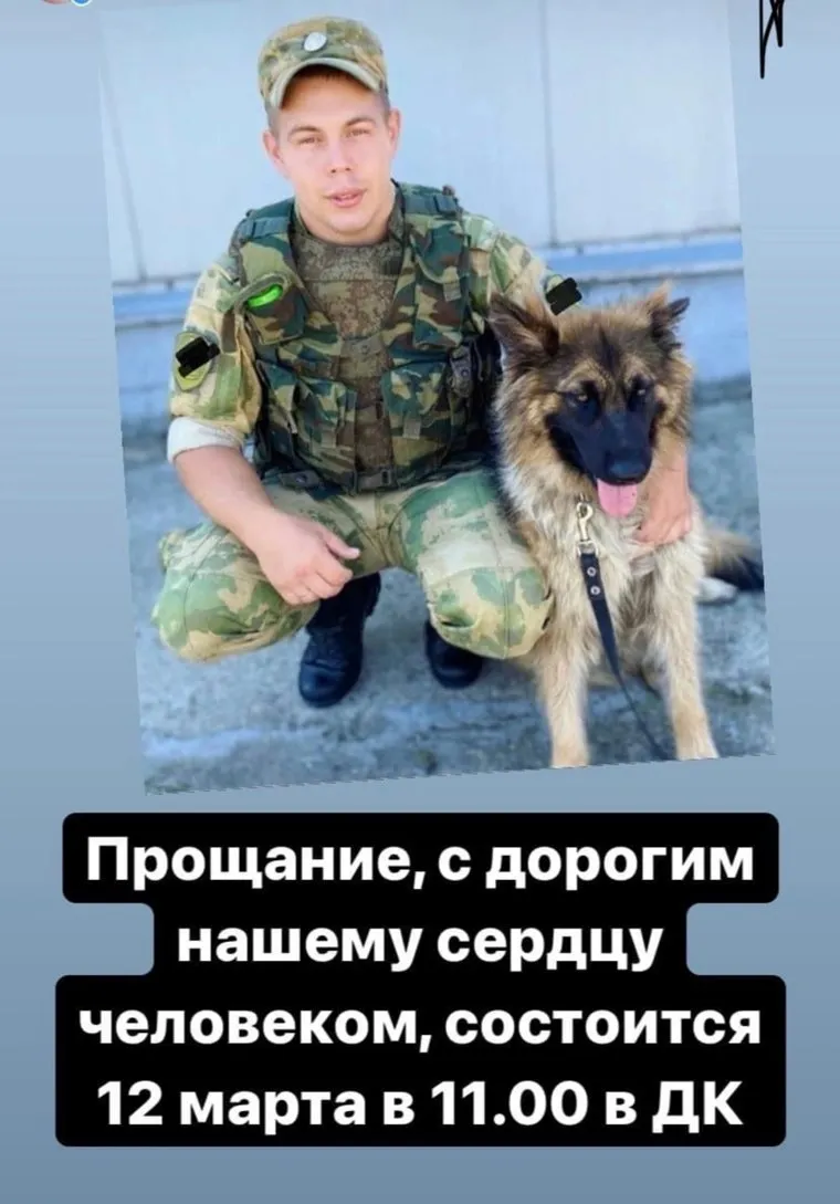 «Сержант Росгвардии Евгений Дудин героически погиб 27 февраля во время военной операции РФ на Украине. Женя был кинологом, на служебном задании работал вместе со своей собакой. Ее не могут найти: возможно, тоже погибла, а, возможно, и нет. Мы попросили, если собаку найдут, чтобы переправили сюда, на родину», — рассказал Евгений Шарин.