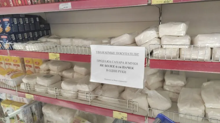 «Уважаемые покупатели! Продажа сахара и муки не более шести пачек в одни руки», — говорится в объявлении, размещенном на непустой полке. Цена одной пачки сахара в «Кировском» — 79,99 рубля. В отношении других товаров собеседник агентства такого правила не заметил. Действует оно только в магазине на ЖБИ или является повсеместным, уточнить к моменту публикации не удалось: владелец «Кировского» Игорь Ковпак не ответил на звонок корреспондента. Ранее он объяснял журналистам, что дефицит сахара, гречки и муки в магазинах создается самими покупателями, причем напрасно, поскольку на складах этих товаров достаточно. Примерно об этом же URA.RU говорили и чиновники мэрии , которые регулярно совещаются с топ-менеджерами продовольственных сетей.