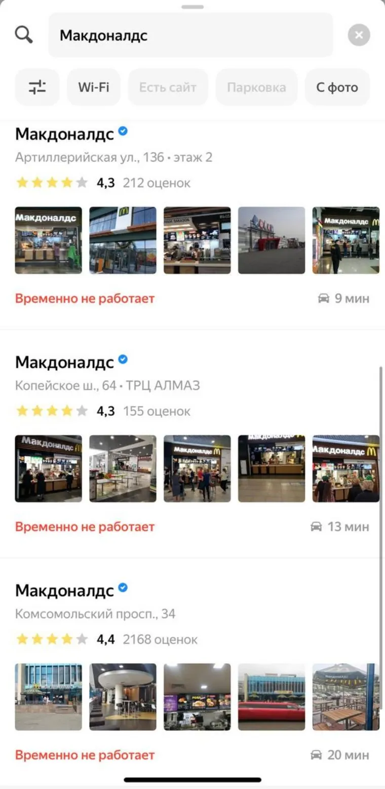 Поисковики Yandex и Google отображают челябинские рестораны McDonald’s, как временно закрытые. В реальности же рестораны продолжают работать.
