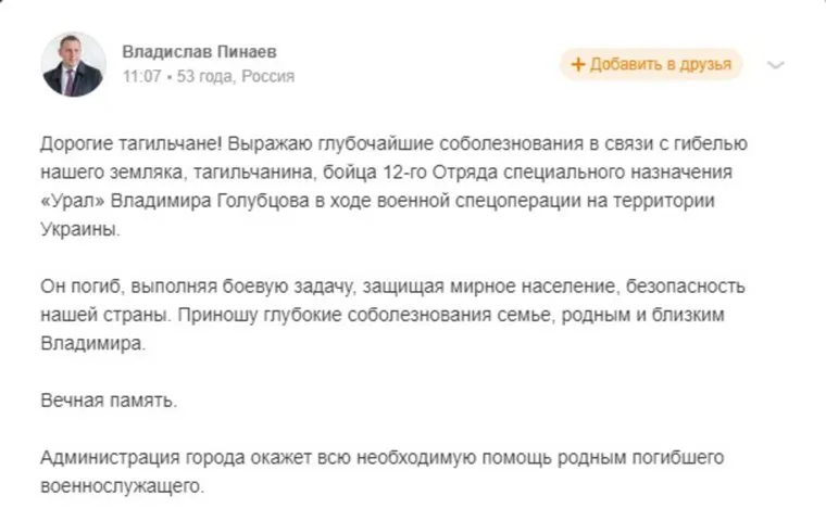 «Дорогие тагильчане! Выражаю глубочайшие соболезнования в связи с гибелью нашего земляка, тагильчанина, бойца 12-го Отряда специального назначения „Урал“ Владимира Голубцова в ходе военной спецоперации на территории Украины», — написал глава города в соцсети «Одноклассники».