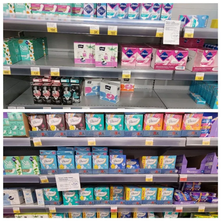 На подавляющее большинство видов женских прокладок в «Лентах» югорских магазинов сейчас установлены желтые и красные ценники, что, как заявляется торговыми сетями, дает возможность сэкономить до 35% при покупке. Впрочем, сами покупательницы не исключают, что это маркетинговый ход. «Еще второго марта я покупала прокладки „Котекс“ (производитель — корпорация Kimberly-Clark, не заявлявшая об уходе с российского рынка) по 80 рублей по акции, а сейчас по акции они стоят 204 рубля. Но в целом полки не пустые, товара маловато, снизился ассортимент, но все есть», — рассказывает Екатерина Силкина из Нижневартовска.