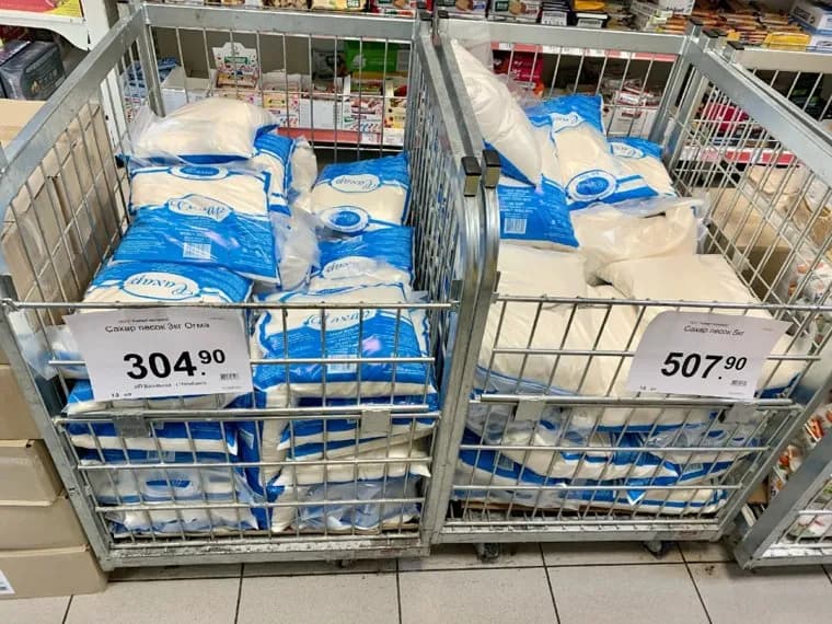 В Озерске (Челябинская область) в сети супермаркетов «Три богатыря» продают сахар свыше 100 рублей за килограмм. Жители города опубликовали фото в социальных сетях, на котором сахар продается в пакетах по три и пять килограмм, цена пакета 305 и 508 рублей, соответственно.