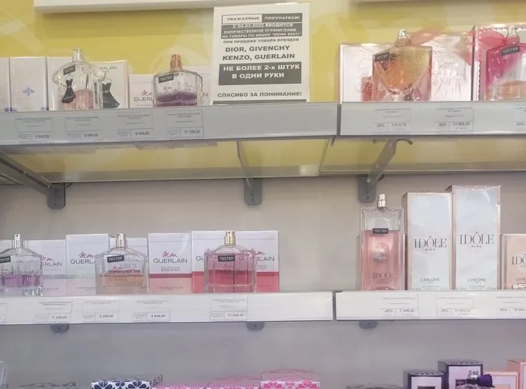 «Уважаемые покупатели! Вводится количественное ограничение на товары по акции „Цены 2021г“ при продаже товара брендов Dior, Givenchy, Kenzo, Guerlain не более 2-х штук в одни руки», — указано в объявлении.