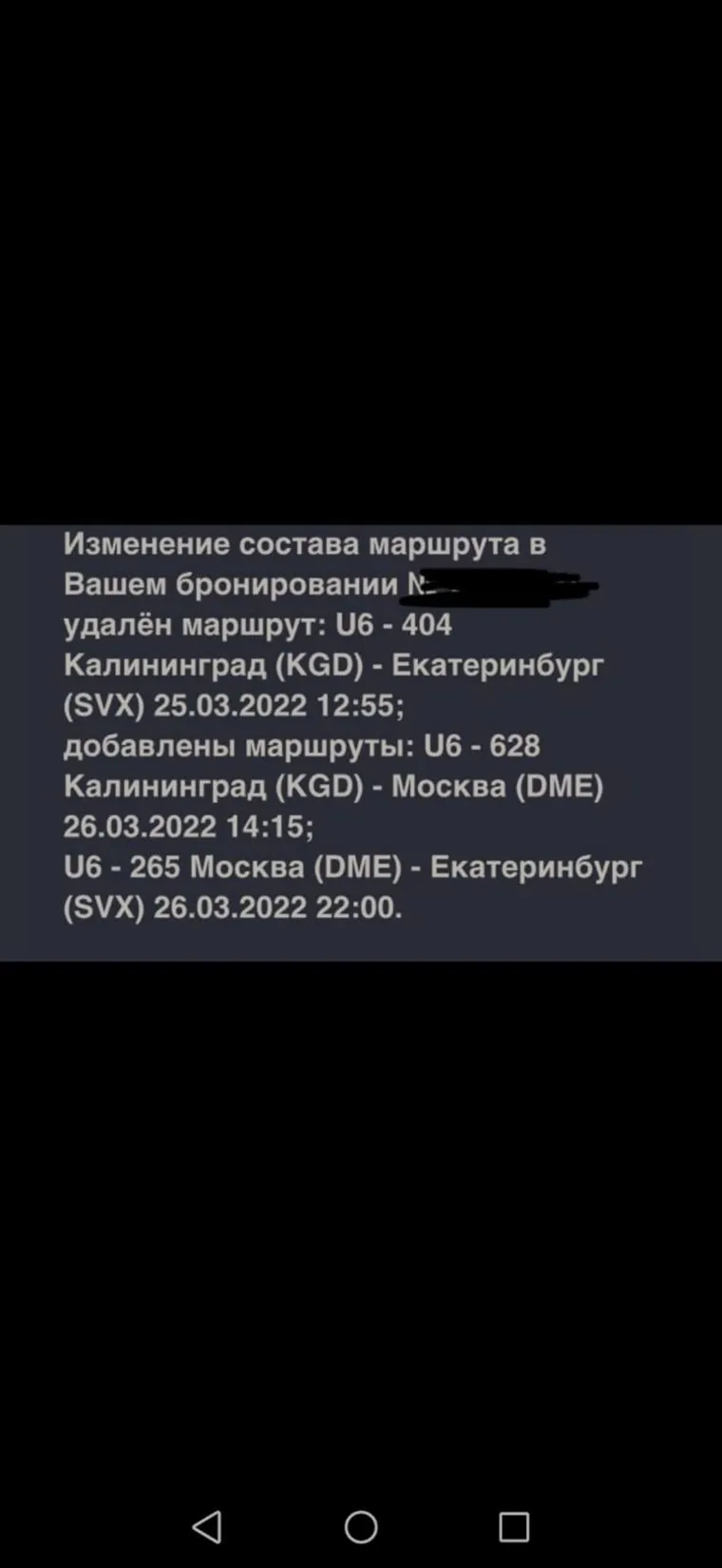 «11 марта на почту пришло оповещение о рейсе: «Отменен рейс U6-404 Калининград-Екатеринбург 25 марта. Пассажиры пересажены на рейсы: U6-628 Калининград-Домодедово, вылет 25 марта в 13:55, прибытие в 16:55, и U6-263 Домодедово-Екатеринбург, вылет 25 марта в 20:35, прибытие в 00:55», — рассказал анонимный источник. Он подчеркивает, что ему пришлось смириться, что рейс не прямой и придется ждать пересадки в Домодедово четыре часа.