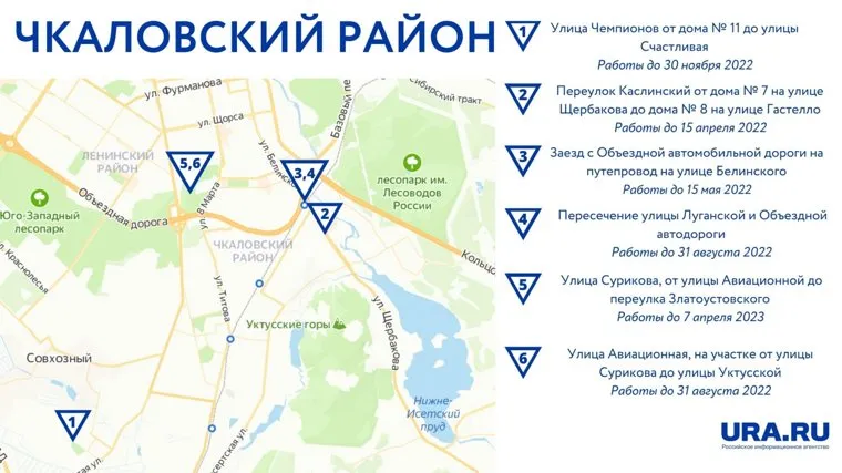 Только в Чкаловском районе перекрыто шесть участков. В список входит строительство дороги в районе Солнечном и ремонтные работы на улице Авиационной. Также перекрыто два участка на Объездной автодороге и один закрыт для движения на улице Щербакова.