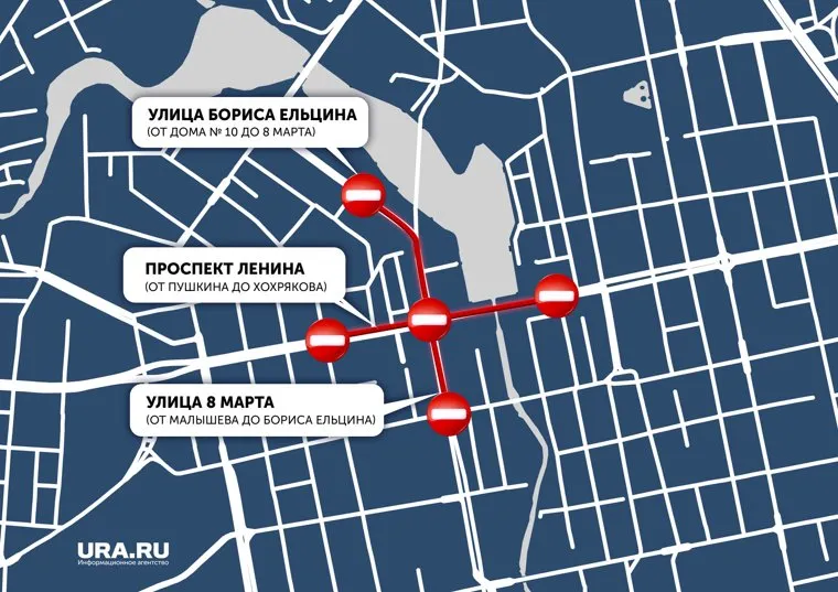 В центре перекрывать движение будут на 8 Марта (Малышева — Ельцина), Ельцина (от дома №10 до 8 Марта) 20, 25, 27, 29 апреля и 5 и 7 мая в период с 20 до 4 часов утра последующих дней. По подобной схеме будут перекрыты пр. Ленина (К. Либкнехта — Репина), Репина (пр. Ленина — Малышева) и Татищева (Репина — Мельникова) 25 и 29 апреля, а также 5 и 7 мая с вечера до утра следующего дня. Также в центре будет перекрыт проспект Ленина (от Пушкина до Хохрякова) с 8 часов вечера 20 и 27 апреля до 4 часов утра последующих дней.