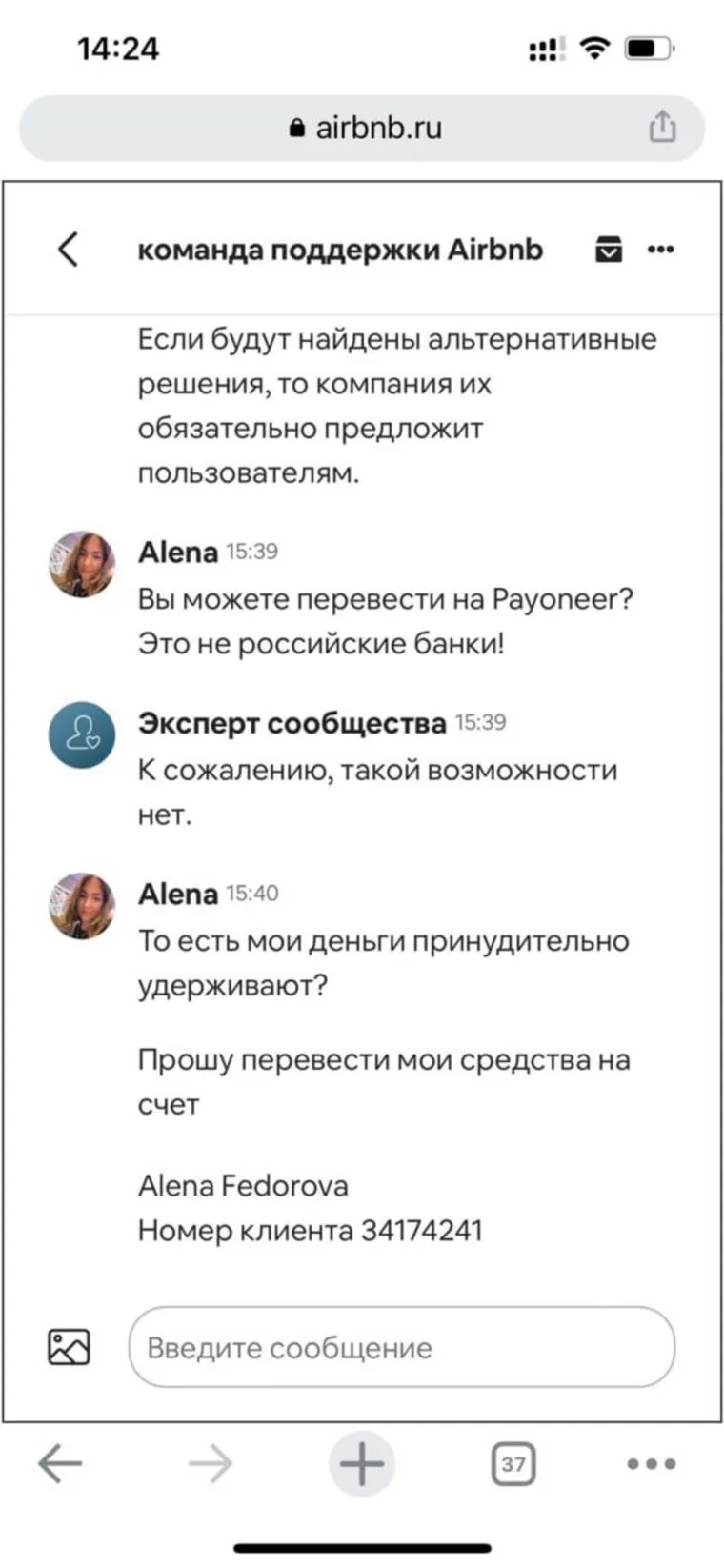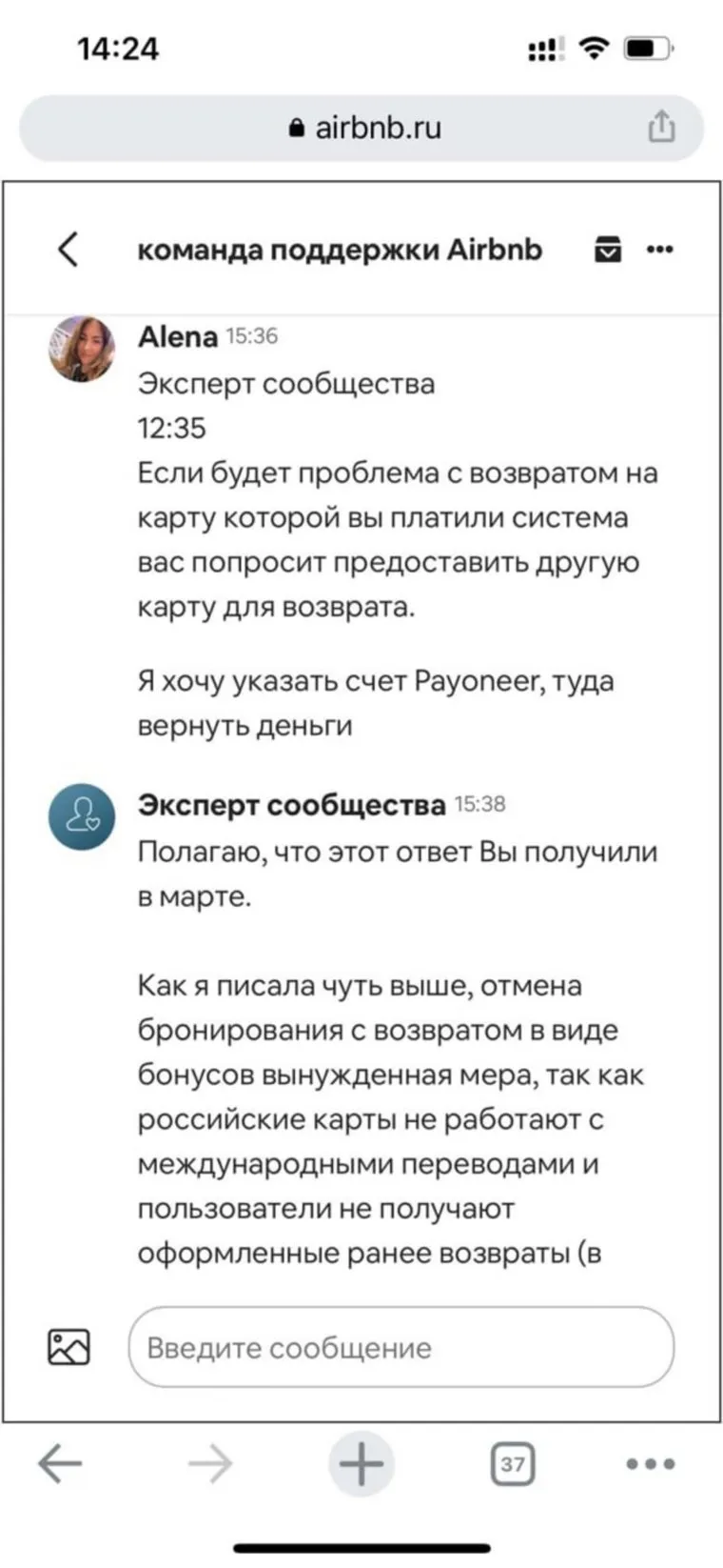 Пользователь Airbnb Алена попыталась предоставить компании иностранный счет для возврата средств. «Мне не нужны бонусы. Может, в РФ никогда больше не будет работать этот сайт. Вы можете перевести на Payoneer, это не российские банки», — написала девушка, предоставив затем данные для перевода. В службе поддержки ей ответили отказом: «К сожалению, такой возможности нет».