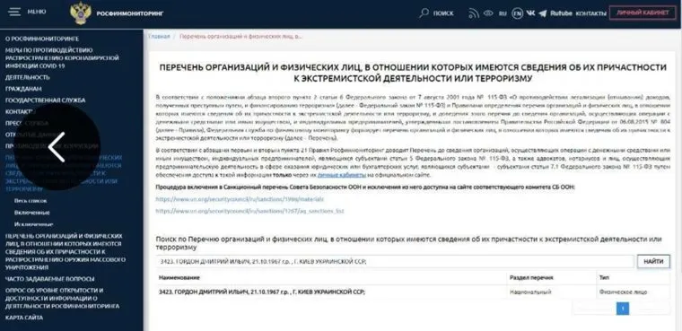 «Поиск по Перечню организаций и физических лиц, в отношении которых имеются сведения об их причастности к экстремистской деятельности или терроризму — 3423. Гордон Дмитрий Ильич, 21.10.1667 г. р. г. Киев Украинской СССР», — указано на сайте федеральной службы.