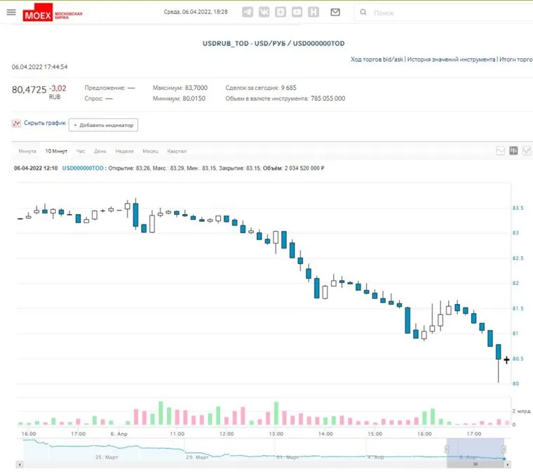 Доллар упал до 80 рублей впервые с февраля. Скрин