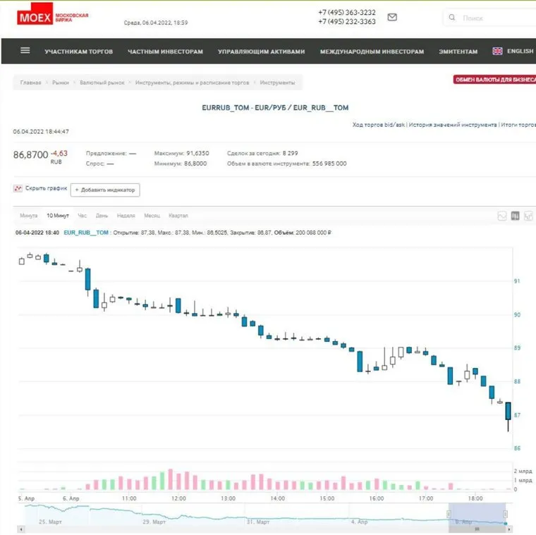 «Доллар опустился до 80 рублей. Курс евро опустился до 86 рублей», — следует из данным Мосбиржи.