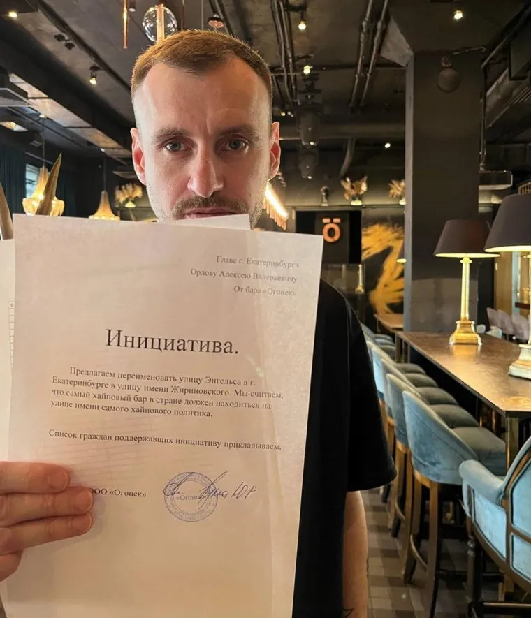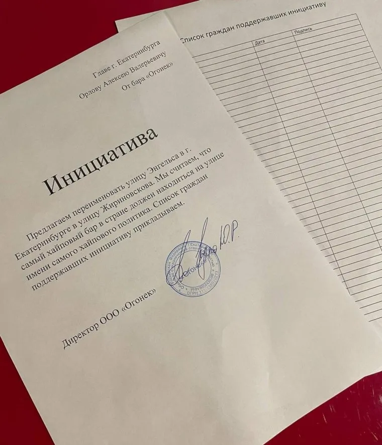 «Уважаемый Орлов Алексей Валерьевич, мы просим переименовать улицу Энгельса, на которой находится наш бар, в улицу имени Жириновского. Мы считаем, что самый хайповый бар страны должен находиться на улице, названной в честь самого хайпового политика», — написал Кексин. Также он призывает поддержать данную инициативу: любой желающий может прийти в бар «Огонек» и поставить подпись в петиции.