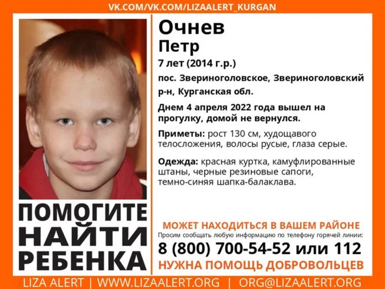 Семилетний Петр Очнев пропал днем 4 апреля в Селе Звериноголовское. Ранее URA.RU сообщало, что к поиску мальчика присоединились добровольцы из Тюмени и Челябинска, так же к поиску подключили водолазов и беспилотный летательный аппарат. Возбуждено уголовное дело по статье «убийство» . Всех, кому что-либо известно о местонахождении ребенка, просят сообщить информацию в дежурную часть УМВД 42-12-98, по «02», номеру 112, на горячую линию отряда «ЛизаАлерт» 8(800)700-54-52.