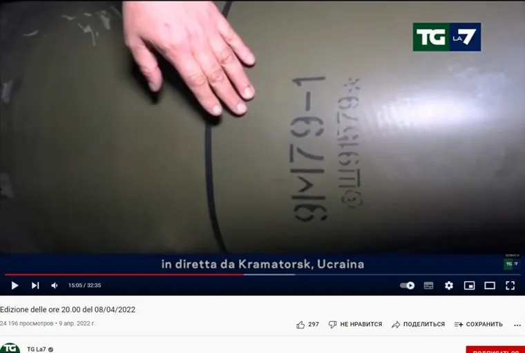 «Виден серийный номер ракеты „Точка-У“. До этого [в обстрелах] на Донбассе засветились украинские ракеты Ш91565, Ш91566. Та же серия, что в Краматорске, отличия — 13 единиц в серийнике [серийном номере]», — говорится в telegram-канале СМИ.