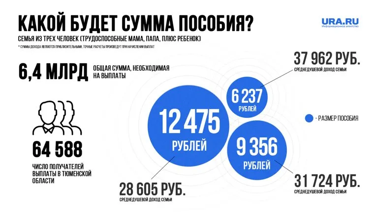 Чтобы получить поддержку, среднедушевой доход семьи (т.е. сумма на одного человека) должен быть не более 12 654 рублей. Так, для трех человек — не превышать 37 962 рублей. В таком случае сумма поддержки составит 50% от прожиточного минимума на ребенка. В случае с Тюменской областью — 6237,5 рублей.