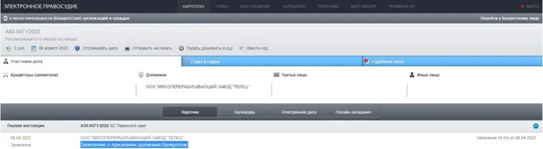 В Арбитражный суд Пермского края поступило заявление с требованием о признании банкротом мясоперерабатывающего завода «Телец». Иск, согласно данным, указанным на сайте суда, подан самим предприятием.