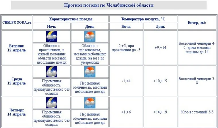 «Днем вторника, 12 апреля, будет облачно с прояснением. Местами небольшие дожди, на юге до умеренных. Небольшие дожди ожидаются в Челябинской области также в дневное время 13 и 14 апреля. В самом Челябинске без особых осадков, лишь четверг днем может пройти небольшой дождь», — пояснили URA.RU в областном ЦГМС.