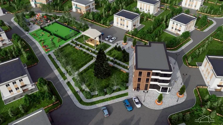 Вот так будет выглядеть поселок: здесь и дома, и площадки, и парковки, и даже сцена для концертов