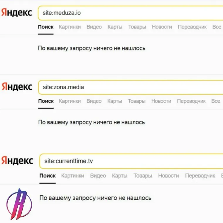 Из поисковой выдачи «Яндекса» пропали ссылки на сайты «Медузы» (признана в России СМИ-иноагентом) и «Медиазоны» (также внесена Минюстом в список СМИ, выполняющим на территории РФ функции иностранного агента). Это произошло после того, как их включили в реестр запрещенных сайтов Роскомнадзора.