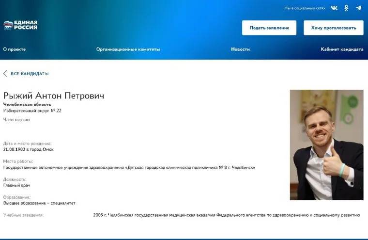 Главный врач детской поликлиники №8 Челябинска Антон Рыжий, баллотировавшийся в 2021 году в Госдуму от партии «Единая Россия», собрался участвовать в довыборах в совет депутатов Калининского района города. Соответствующая заявка появилась на сайте электронного партийного голосования.