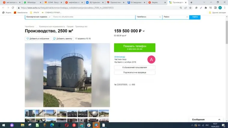 «Продается действующая нефтебаза. Объем нефтебазы составляет 2500 кубометров. Стоимость 159 млн 500 тыс. рублей», — говорится в объявлении на сайте «Авито».