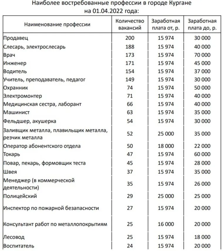 «Наиболее востребованные профессии в Кургане на 1 апреля: продавец. Открыто 200 вакансий. Заработная плата от 15,9 до 30 тысяч рублей», — указано в отчете департамента экономического развития, торговли и предпринимательства.