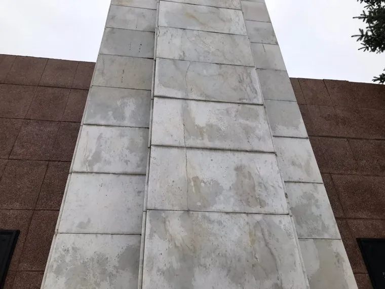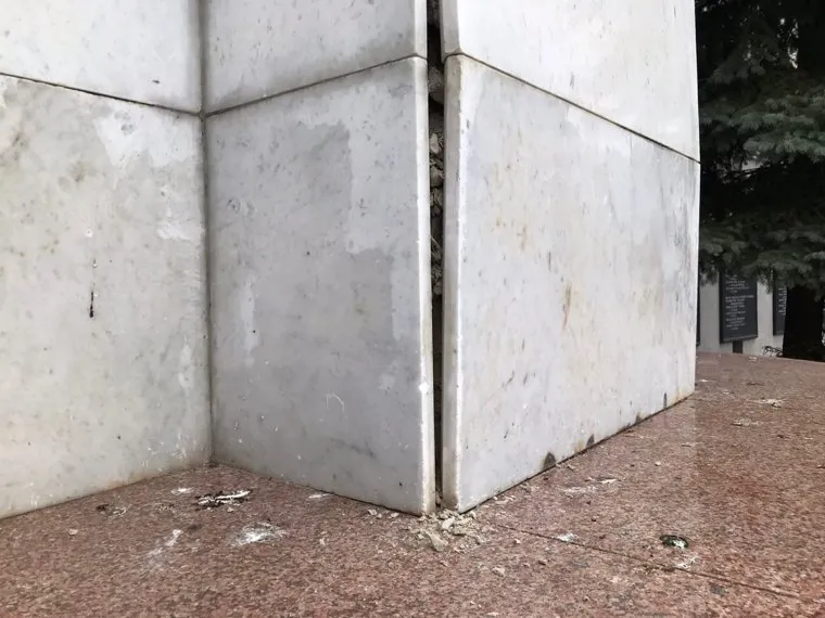 В некоторых местах стелы «Орден Победы» повреждена плитка