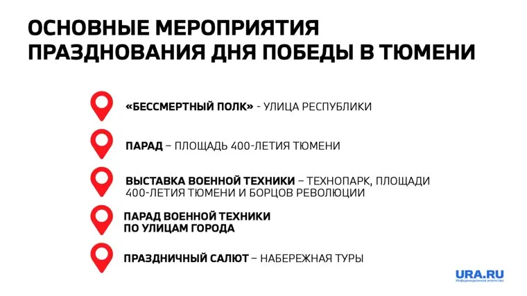 Согласно документу, подписанному губернатором Александром Моором, праздничная программа на 9 Мая в Тюмени стартует с шествия «Бессмертного полка» (с портретами фронтовиков и тех, кто пал в локальных конфликтах, в том числе — в ходе спецоперации на Украине ) и прохождения войск тюменского гарнизона. Приблизительное время начала — 10:00. Место действия — Центральная площадь и улица Республики.