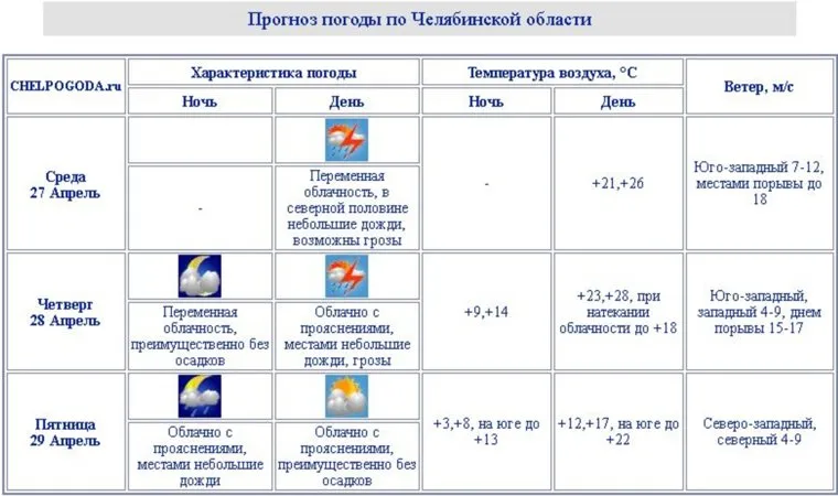 В течение двух суток в регионе ожидаются также дожди и первые грозы. В пятницу, 29 апреля, на Южном Урале станет прохладнее — от 12 до 22 градусов тепла. В этот день прекратятся и осадки.