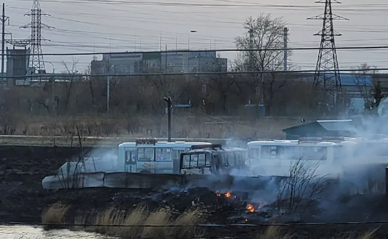 В Кургане из-за ландшафтного пожара в микрорайоне Кулацкий сгорел автобус ПАЗ. Фотографии очевидцы опубликовали в социальных сетях.