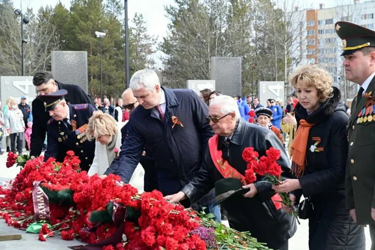 11:41 Губернатор Дмитрий Артюхов, мэр Салехарда Алексей Титовский и председатель законодательного собрания ЯНАО Сергей Ямкин возложили цветы к монументу памяти защитникам Родины