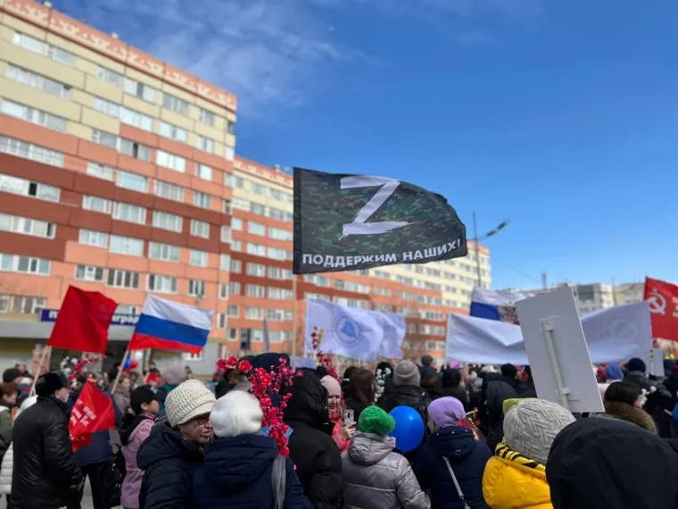 11:18 В колоннах несут флаги с буквой Z и надписью «Поддержим наших!». Кое-где видны флаги ДНР и ЛНР.