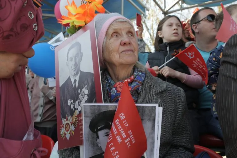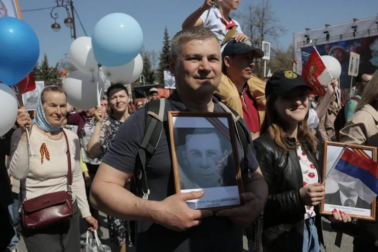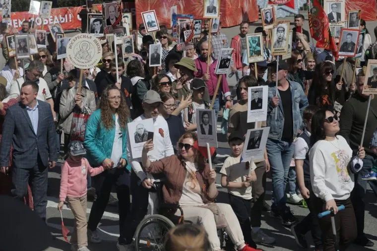 10:53 . Тюменцы пришли на парад с портретами родных — участников Великой Отечественной войны