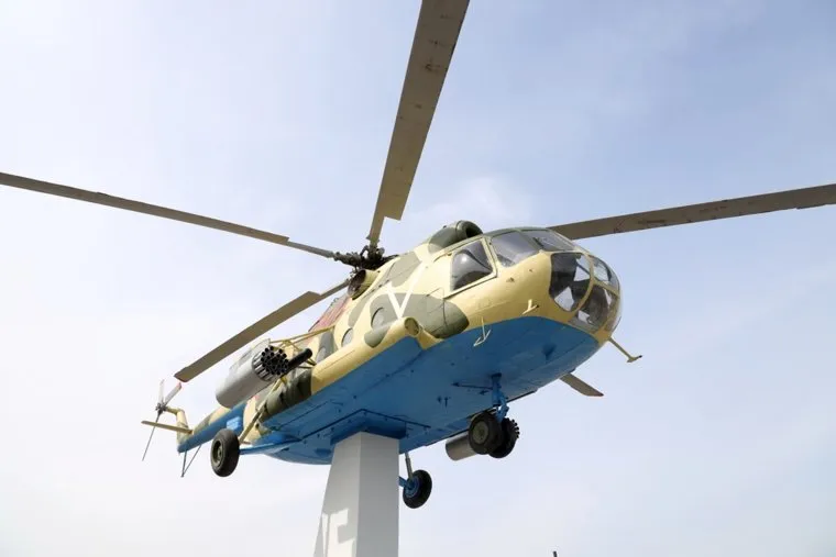 Обелиск в поддержку Вооруженных Сил РФ выполнен в виде вертолета МИ-8 на постаменте